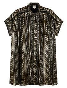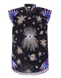 Ouverte sur le bas, elle descend jusqu’aux chevilles et dessine ainsi une silhouette très féminine Une ravissante patte de boutonnage court sur toute sa longueur, partant de son adorable petit col italien. Les minces rayures de lurex qui rythment son imprimé lui confèrent un éclat exceptionnel, renforcé par les deux étoiles brodées sur chacune des épaules et l’œil protecteur, emblématique du thème, brodé de perles de rocaille sur le haut du dos