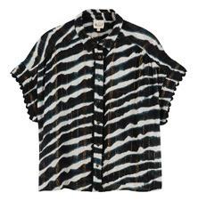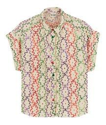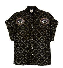 Cette chemise à la coupe courte et oversize et aux manches amples, soulignées par un croquet doré, est confectionnée dans une viscose de coton entièrement rebrodée de formes florales graphiques et de sequins Une broderie extravagante faite de perles violettes, noires et vertes dessine deux yeux protecteurs posés au niveau des épaules Déclinée en trois couleurs, blanc cassé, noir et bleu, elle s’assortit avec le short Céline pour un ensemble twin-set parfait!