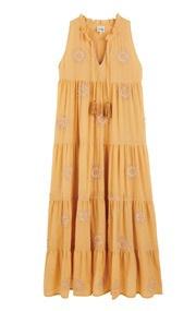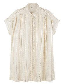 La robe Claire confectionnée dans une gaze de coton légère agrémentée de soleils brodés à la main est une robe chemise, à la coupe joliment oversize Au niveau des épaules et du dos, un empiècement exceptionnel confectionné d’un voile entièrement brodé de sequins rappelle le rythme travaillé et solaire des bracelets brésiliens