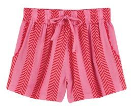 Ornées de somptueux palmiers dorés brodés, ce thème d’exception annonce en grande pompe l’ouverture d’une saison estivale que l’on veut, chez WILD, joyeuse et colorée Confectionné en jacquard de coton strié de larges rayures en chevron rouge magenta sur fond rose, Oriana est un kaftan long aux manches ¾ Sa forme très large fait écho aux tenues méditerranéennes et ses fentes sur les côtés lui apportent une touche très féminine La ligne de vêtement est soulignée par un croquet rouge magenta qui court le long de l’encolure, sous la poitrine, sur le bas de manche et le bas de vêtement Ses palmiers brodés de fils de lurex et de perles de rocaille nous invitent à plonger avec délectation dans la saison estivale