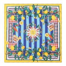 Nos foulards sont faits à la main et sont parés de dessins originaux destinés à sublimer votre garde-robe Vous est présenté ici l’imprimé Sicily, décliné en deux coloris, qui nous transporte avec une euphorie solaire dans le sud de l’Italie Les éclatants citrons siciliens, accompagnés de boîtes de sardines, de piments rouge vif et de feuilles d’olivier, sont tous harmonieusement disposés sur un fond uni rayé de larges bandes