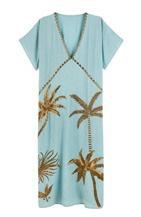 Tandis qu’elle émerge doucement sur nos thèmes d’entrée de saison, la tendance « bijou » sur le prêt à porter se confirme pleinement dans notre thème estival « palmiers » Agrémentée de broderies artisanales exquises, cette collection révèle une identité affirmée et une féminité audacieuse. Avec ses motifs exceptionnels, elle annonce un été opulent et somptueux, sublimant des silhouettes à la fois sensuelles et raffinées. De forme caftan – djellabah réinterprétée « bijou » , la robe Annie se distingue par son incroyable volume et sa confection en gaze de coton Son devant est magnifiquement orné de perles de rocaille dorées et gun, illustrant des motifs de palmiers exceptionnels, témoignant d’un travail artisanal remarquable Ouverte sur chaque côté, elle descend jusqu’aux chevilles, renforçant ainsi le volume précieux de la djellabah Ultra féminine, elle arbore un décolleté en V profond et des manches courtes. Elle se décline en quatre couleurs, blanc, rose, bleu et noir qu’on chérit chacune sans modération!