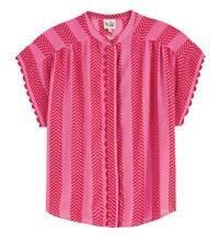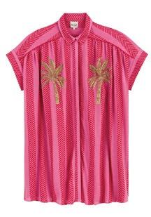 Cette robe chemise, dont la forme revient de façon récurrente dans notre collection estivale, séduit par sa forme iconique et sa coupe confortable aux manches courtes et devient un essentiel de notre été On adore son côté vaporeux avec cette gaze en jacquard de coton strié de larges rayures en chevron rouge magenta sur un fond rose vif et sa palmeraie brodée de perles de rocaille et de fils lurex sur la poitrine