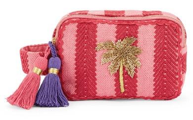 A l’instar de la trousse Lucian, la pochette Zoé, de forme vanity revisitée, hisse notre été à un niveau de chic absolu En écho à notre thème de prêt à porter, elle se pare de nos palmiers exceptionnels qui sont, entièrement brodés de perles dorées et exhibés sur un fond rose vif strié de chevrons fuchsia Son puller orné de deux pompons en perles de rocailles roses et violettes, offre à la trousse Zoé une touche colorée et bohème