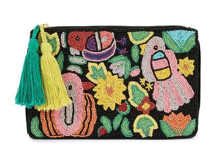 Solaire et colorée, notre pochette Lorelai se construit autour d’une forme trousse assez versatile puisqu’elle se porte aussi en sac à main grâce à sa jolie anse chaîne dorée. Entièrement brodée sur le devant de formes géométriques dans les tons rose bonbon, beiges, dorés, bleu cyan, turquoise, fuchsia, oranges et violets, elle est l’accessoire qui match toutes nos tenues avec une évidence déconcertante