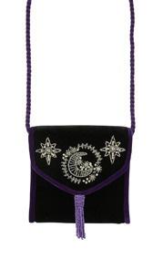 La version violette est intégralement confectionnée d’un velours uni violet profond sur lequel une magnifique broderie d’un œil mi-clos se dessine en fils de lurex argentés et les cils en perles de rocaille. De part et d’autre de la broderie, une constellation d’étoiles stylisées argentées illumine la pochette et le pompon dont se pare le puller ajoute la touche de chic essentiel à ce superbe accessoire