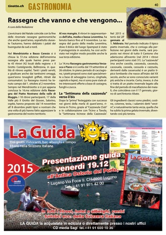 Rassegne che vanno e che vengono... A cura della Redazione L’avvicinarsi del Natale coincide con la fine delle rinomate rassegne gastronomiche che anche quest’anno, soprattutto durante l’autunno, hanno deliziato i palati dei buongustai da sud a nord. Nel Mendrisiotto e Basso Ceresio si è chiusa la 51.ma edizione dell’omonima rassegna alla quale hanno preso parte 43 ritrovi (42 locali della regione + il Grotto Castelgrande, Bellinzona, in qualità di ritrovo ospite). Tanti i piatti serviti, a giudicare anche dai tantissimi omaggi, quest’anno tovaglioli griffati, ritirati dai consumatori. La Rassegna momò ha tenuto campo dal 1. ottobre al 2 novembre. Sempre nel Mendrisiotto si è poi appena conclusa la 16.ma edizione della Rassegna del Piatto Nostrano della valle di Muggio. I 18 ritrovi partecipanti, 17 della Valle più il Grotto del Giuvan, Salorino, ospite, hanno proposto dal 14 novembre all’ 8 dicembre piatti tipici e nostrani che una volta di più hanno fatto apprezzare la gastronomia del nostro territorio.