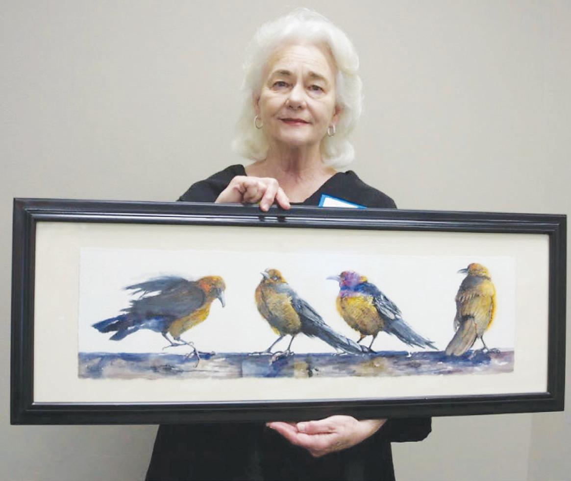 The Weatherford Art Association chose the top three artists for January 2023. They are, from left, Cindi Neverdousky (3rd), “Peaches,” oil painting; Linda W. Young (1st), “...And A Good Cup of Coffee,” acrylic painting; and Carmen Davailus (2nd), “Grace and Strength,” photograph on metal.