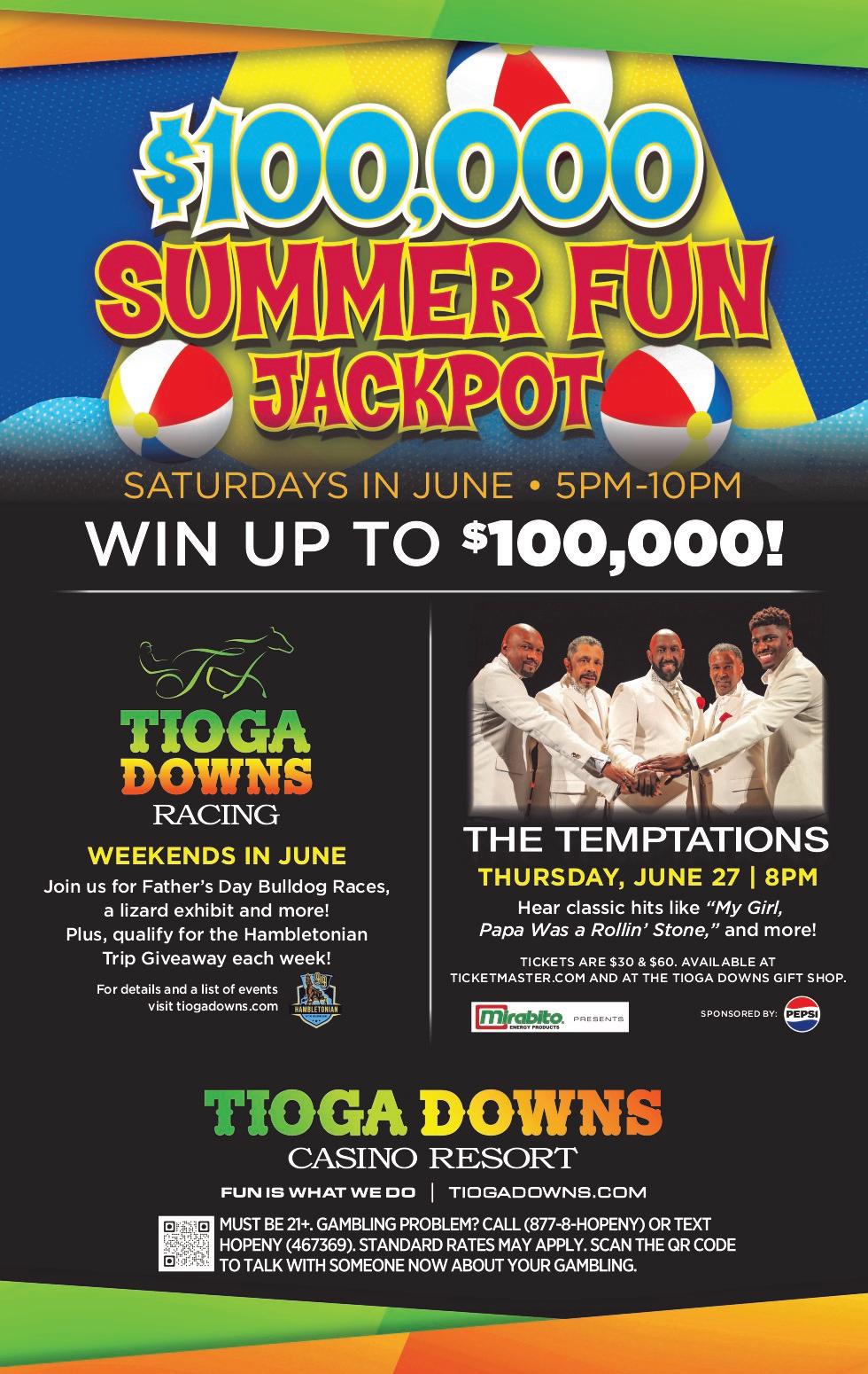 ABOUT: Tioga Downs Casino Resort is the premier gaming center in the Southern Tier. The property features more than 890 slot machines, 28 table games, and six poker tables. The resort is also home to some of the most competitive harness racing in the state of New York at its historic 5/8 mile racetrack. Families can also dine at one of its four restaurants, including the popular P.J. Clarke’s. You must be 21 years of age or older to play at the resort. Please play responsibly.