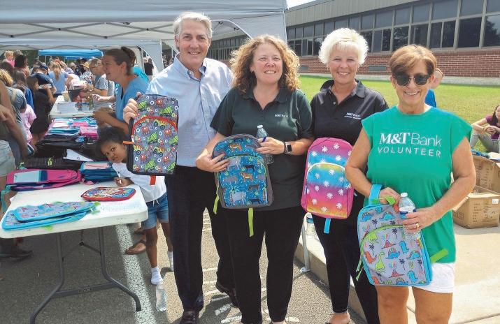 Volunteers from M&T Bank hand out backpacks at last year’s Back to School Party