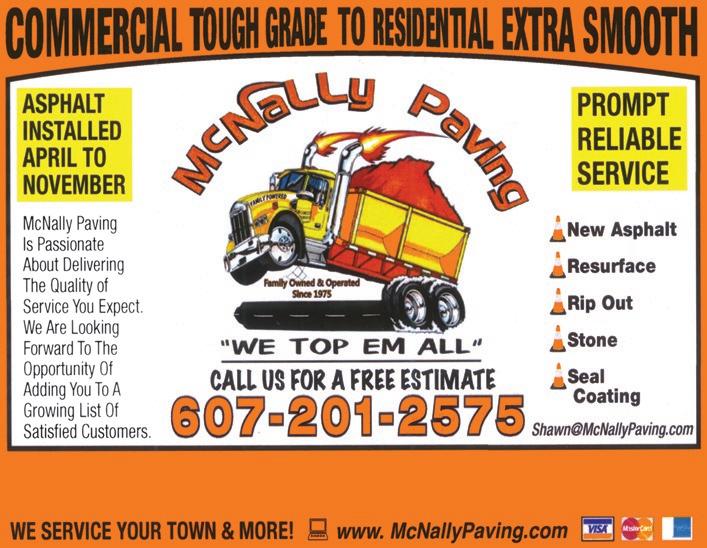 OCTOBER 2022 TIOGA COUNTY COMMUNITY PRESS PAGE 3 CALL 607-754-0707 19 Delaware Ave., Endicott, NY 13760 • RESIDENTIAL • COMMERCIAL • INSTALLATIONS • 607-759-9282 • Apalachin, NY Email: mwbmwmrw@aol.com www.MikesGroundworks.com Stream & Ditch Repair Gravel Mulch Topsoil Excavation Retaining Walls FREE ESTIMATES FULLY INSURED Spencer Family, Newark Valley, and Owego Community Garden Apartments Non-Smoking Facility One and two bedroom units available for rent Available for qualifying low-income families, elderly and disabled persons of any age. Rent is based on income. Heat, hot water and garbage included. Laundry room on site. 19 Orchard Street, Spencer, N. Y. 14883 Office: 607-589-4630 TDD 800-662-1220 The Terrace TheFriendlyNeighborhoodTavern Rt. 434, Apalachin, New York 625-3935 Serving Lunch & Dinner or Just a Snack! Stop in and try our Homemade Soup Specials Wednesday - Shrimp Nite  Mon Fri 8am 5pm Oil Changes • Tires • Batteries & All Repairs 8240 Route 434 (1.4 miles east of Pa. Ave.) Apalachin (607) 258-0008