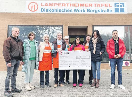 DaherwareskeineFrage,auch indiesemJahrvielfältigesoziale ProjekteimgesamtenKreiszu unterstützen–jeweils3.000Euro gehendabeiandieDLRGBiblis, dieTafelLampertheim,dasZentrumderWohnungslosenhilfe desDiakonischenWerkesBergstraße,dasTierheimHeppenheimundanTiereinNotOdenwalde.V.DasGeldfürdieTafel LampertheimwirdinTeilenauch derTafelBürstadtzugutekommen,dahierauchMenschenaus BiblisunddamitdemSitzder FiegeLogistikGmbHKundesind.