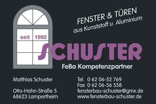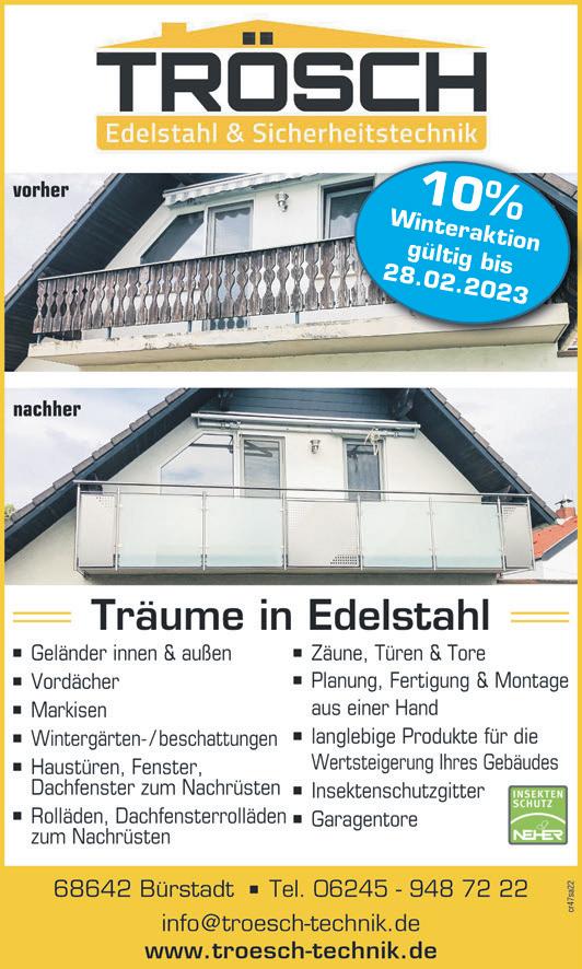Schützenstraße50•68623Lampertheim•Tel.06206-94500•Fax06206-945010• www.tip-suedhessen.de info@tip-suedhessen.de Samstag,21.Januar2023·KW03·47.Jahrgang SÜDHESSEN DIEGRATISZEITUNGFÜRDASRIED GmbH WENN GLAS DANN GRIMM Energetische Sanierung? Planen Sie jetzt schon Ihre Pojekte für 2023 mit uns. GLAS UND ACRYLGLAS Weinsheimer Straße 59b 67547 Worms Tel. 0 62 41 - 4 49 00 www.glas-thomas.de Fenster · Ganzglastüren · Wintergärten Ganzglasanlagen · Überdachungen Iso-Verglasungen · Küchenrückwände Glasduschen · Glasgeländer SchrottHofmann/Walter-Bothe-Straße10/68169Mannheim/Tel.0621311778/Fax.0621315213/hofmann-schrott@t-online.de www.schrott-hofmann.de AnnahmevonEisenschrottundBuntmetallen AnnahmeundBehandlungvonKabeln(Kaltzerlegung/Kabelschredder) Rohstoffrecycling Containerstellung Demontagearbeiten Brennarbeiten