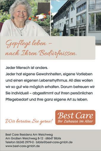 www.hdv.agaplesion.dewww.hdv.agaplesion.de Stationäre Pflege, Kurzzeitpflege, Tagespflege Vielfältige Freizeit- und Betreuungsangebote Aktivierende, ganzheitliche Versorgung AGAPLESION MARTIN LUTHER HAUS Odenwaldstraße 1, 67551 Worms T (06247) 90 45 00 - 0 AGAPLESION SOPHIENSTIFT Römerstraße 18-22, 67547 Worms T (06241) 904 - 0 AGAPLESION DIETRICH BONHOEFFER HAUS Hospitalstraße 1, 68623 Lampertheim T (06206) 955 - 0 Hausseelsorge, Gottesdienste und Andachten (ev. / kath.) Täglich frisch zubereitete Mahlzeiten aus der eigenen Küche Mitten im Leben: Zentrale Lage im Ortszentrum Zuhause in christlicher Geborgenheit In der über 100-jährigen Tradition des Hessischen Diakonievereins In Trägerschaft der HDV gemeinnützige GmbH, Darmstadt. Im Verbund der AGAPLESION gAG. Stationäre Pflege, Kurzzeitpflege, Tagespflege • Vielfältige Freizeit- und Betreuungsangebote Aktivierende, ganzheitliche Versorgung AGAPLESION MARTIN LUTHER HAUS Odenwaldstraße 1, 67551 Worms T (06247) 90 45 00 - 0 AGAPLESION SOPHIENSTIFT Römerstraße 18-22, 67547 Worms T (06241) 904 - 0 AGAPLESION DIETRICH BONHOEFFER HAUS Hospitalstraße 1, 68623 Lampertheim T (06206) 955 - 0 Hausseelsorge, Gottesdienste und Andachten (ev. / kath.) • Täglich frisch zubereitete Mahlzeiten aus der eigenen Küche Mitten im Leben: Zentrale Lage im Ortszentrum Zuhause in christlicher Geborgenheit In der über 100-jährigen Tradition des Hessischen Diakonievereins In Trägerschaft der HDV gemeinnützige GmbH, Darmstadt. Im Verbund der AGAPLESION gAG. Stationäre Pflege, Kurzzeitpflege, Tagespflege • Vielfältige Freizeit- und Betreuungsangebote Aktivierende, ganzheitliche Versorgung AGAPLESION MARTIN LUTHER HAUS Odenwaldstraße 1, 67551 Worms T (06247) 90 45 00 - 0 AGAPLESION SOPHIENSTIFT Römerstraße 18-22, 67547 Worms T (06241) 904 - 0 AGAPLESION DIETRICH BONHOEFFER HAUS Hospitalstraße 1, 68623 Lampertheim T (06206) 955 - 0 Hausseelsorge, Gottesdienste und Andachten (ev. / kath.) • Täglich frisch zubereitete Mahlzeiten aus der eigenen Küche Mitten im Leben: Zentrale Lage im Ortszentrum Zuhause in christlicher Geborgenheit In der über 100-jährigen Tradition des Hessischen Diakonievereins In Trägerschaft der HDV gemeinnützige GmbH, Darmstadt. Im Verbund der AGAPLESION gAG. www.hdv.agaplesion.dewww.hdv.agaplesion.de Stationäre Pflege, Kurzzeitpflege, Tagespflege Vielfältige Freizeit- und Betreuungsangebote Aktivierende, ganzheitliche Versorgung AGAPLESION MARTIN LUTHER HAUS Odenwaldstraße 1, 67551 Worms T 90 45 00 0 AGAPLESION SOPHIENSTIFT Römerstraße 18-22, 67547 Worms T (06241) 904 0 AGAPLESION DIETRICH BONHOEFFER HAUS Hospitalstraße 1, 68623 Lampertheim T (06206) 955 0 Hausseelsorge, Gottesdienste und Andachten (ev. kath.) Täglich frisch zubereitete Mahlzeiten aus der eigenen Küche Mitten im Leben: Zentrale Lage im Ortszentrum Zuhause in christlicher Geborgenheit · In der über 100-jährigen Tradition des Hessischen Diakonievereins In Trägerschaft der HDV gemeinnützige GmbH, Darmstadt. Im Verbund der AGAPLESION gAG. Stationäre Pflege, Kurzzeitpflege, Tagespflege • Vielfältige Freizeit- und Betreuungsangebote Aktivierende, ganzheitliche Versorgung AGAPLESION MARTIN LUTHER HAUS Odenwaldstraße 1, 67551 Worms T 90 45 00 0 AGAPLESION SOPHIENSTIFT Römerstraße 18-22, 67547 Worms T (06241) 904 0 AGAPLESION DIETRICH BONHOEFFER HAUS Hospitalstraße 1, 68623 Lampertheim T (06206) 955 0 Hausseelsorge, Gottesdienste und Andachten (ev. kath.) • Täglich frisch zubereitete Mahlzeiten aus der eigenen Küche Mitten im Leben: Zentrale Lage im Ortszentrum Zuhause in christlicher Geborgenheit · In der über 100-jährigen Tradition des Hessischen Diakonievereins In Trägerschaft der HDV gemeinnützige GmbH, Darmstadt. Im Verbund der AGAPLESION gAG. Stationäre Pflege, Kurzzeitpflege, Tagespflege • Vielfältige Freizeit- und Betreuungsangebote Aktivierende, ganzheitliche Versorgung AGAPLESION MARTIN LUTHER HAUS Odenwaldstraße 1, 67551 Worms T 90 45 00 0 AGAPLESION SOPHIENSTIFT Römerstraße 18-22, 67547 Worms T (06241) 904 0 AGAPLESION DIETRICH BONHOEFFER HAUS Hospitalstraße 1, 68623 Lampertheim T (06206) 955 0 Hausseelsorge, Gottesdienste und Andachten (ev. kath.) • Täglich frisch zubereitete Mahlzeiten aus der eigenen Küche Mitten im Leben: Zentrale Lage im Ortszentrum Zuhause in christlicher Geborgenheit · In der über 100-jährigen Tradition des Hessischen Diakonievereins In Trägerschaft der HDV gemeinnützige GmbH, Darmstadt. Im Verbund der AGAPLESION gAG. AGAPLESION DIETRICH BONHOEFFER HAUS WOHNEN & PFLEGEN Hospitalstraße 1 68623 Lampertheim T (06206) 955 - 0 AGAPLESION SOPHIENSTIFT WOHNEN & PFLEGEN Römerstr. 18-22, 67547 Worms T (06241) 904 - 0