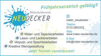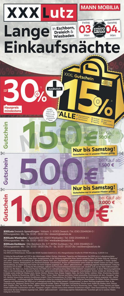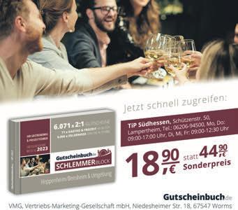 MITTWOCH,1.MÄRZ2023 3 LOKALES DarmstädterStraße74·68647Biblis Tel.06245-7584 Porzellan•Glas•Geschenke•Hausrat•Spielwaren BiometrischePassbilder ab13,99€ Alles trocken! Allesdicht! Trockenlegungen Nasse Keller, feuchte Wände, Haussockel Taunusstraße 6 64683 Einhausen Tel. 06251 / 51275 Mobil: 0175 / 56 22 578 www.steiner-bautenschutz.de DIEKLEINE GESCHÄFTLICHE EMPFEHLUNG 500 m2 Ausstellungsfläche Industriestraße 20 · 68642 Bürstadt Tel. (0 62 06) 63 08 rh33sa17 Schützenstraße50·68623Lampertheim Tel.06206-94500 info@tip-suedhessen.de·www.tip-suedhessen.de SiemöchtenindieserRubrikinserieren? 4WochenWerbung nur99,-€*oder mitOnlineBanner nur149,-€* *(zzgl.MwSt.)