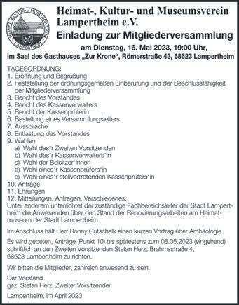 Mitgliederversammlungam 21. Mai um10.30UhrimSportheim WattenheiminderSchulstraße.