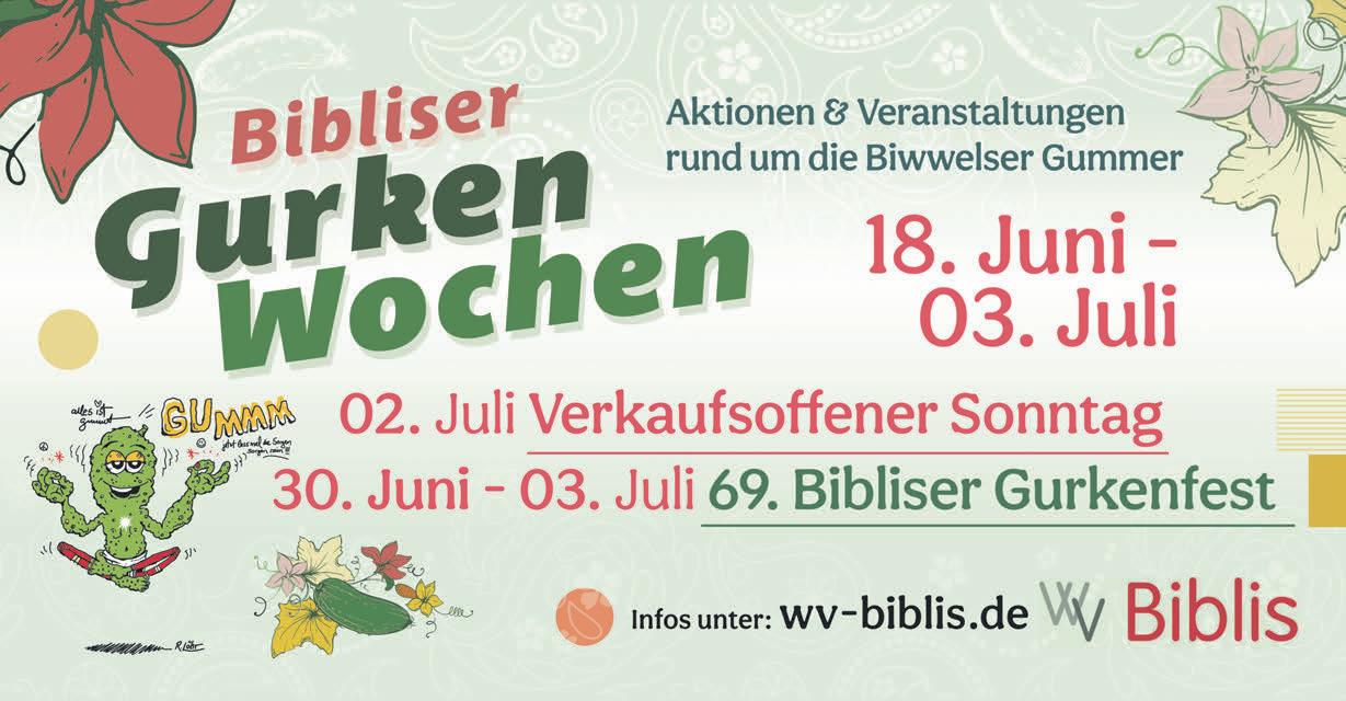 umdasFestinvollenZügenzu genießen.AuftaktderGurkenwochenistamSonntag,18.Juni, von11bis18Uhrmitdem GurkenmarktimHoflädchen OchsenschlägerinBiblis-WattenheimmitderEröffnungderBibliserGurkenwochendurchBür-