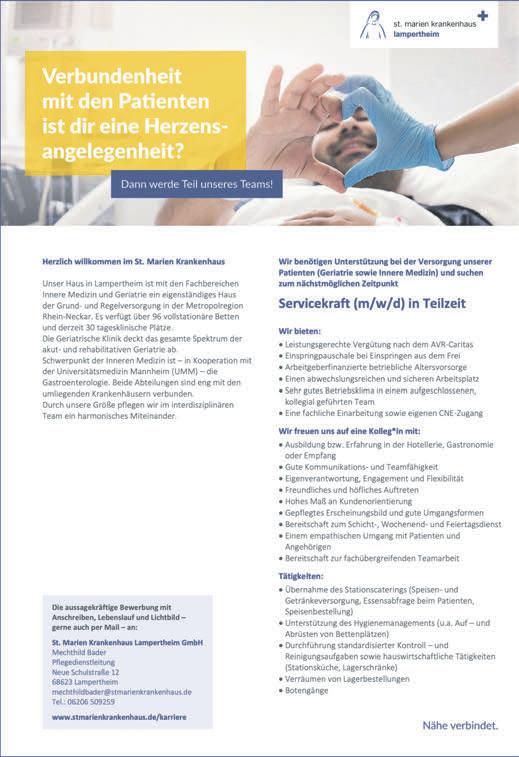MarionHartmannistzuständige AnsprechpartnerindesBetreuungsdienstesbeiderÖkumenischenDiakoniestation,Hospitalstraße1,Telefon06206/9097-0. E-Mail:info@diakoniestationlampertheim.de.