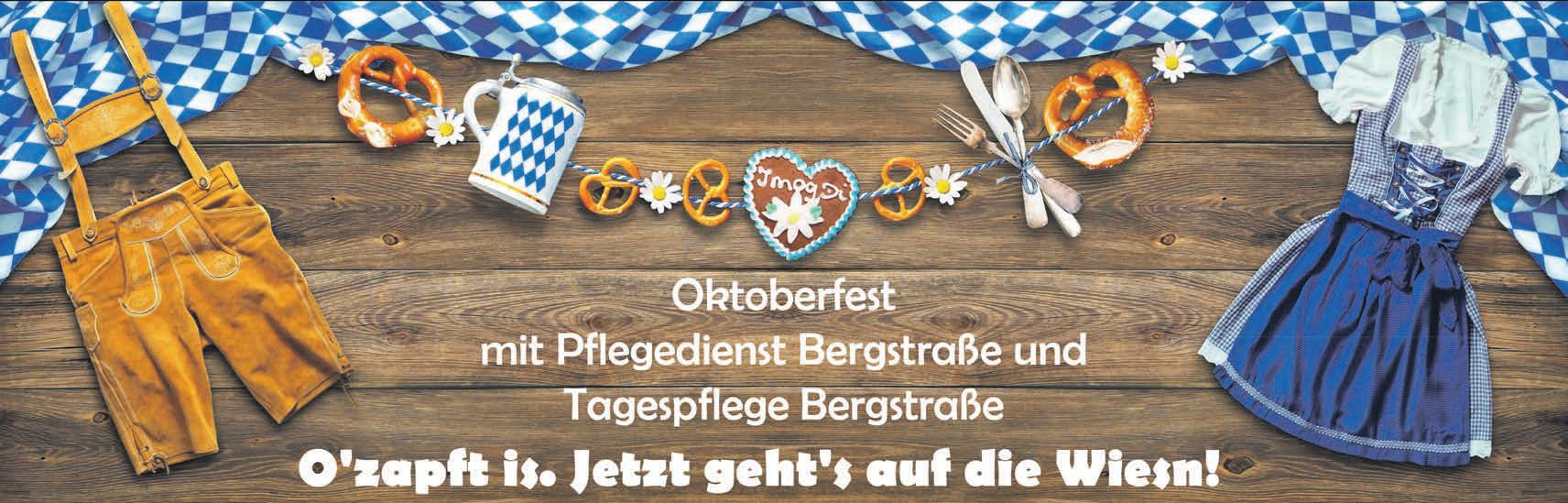 DasOktoberfestfindetam Mi.,26. Oktober,imBürgerzentrumstatt. EswerdenWeißwürstemit Laugenstangenangebotenund dazuguteUnterhaltungmitMusik. AnmeldenkannmansichbeiErika RitterTel.06245/7062oderbei HelgaWetzel06245/3579.Bittebei AnmeldungdieAnzahlder WeißwürsteundLaugenstangen angeben,zurbesserenPlanung.