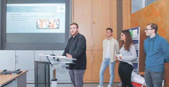Publikumsaßendieanderen ProjektteilnehmerausderKlasse, dieamEndedesVortragsApplaus spendeten.Wieinderbaldigen echtenPrüfungssituationhörten dieExpertengenauzu.Nachder Bildpräsentationkamenim Fachgesprächdievertiefenden Fragen,diedreiLehrerinderRolle alsBankmitarbeiter,mitdem scharfenBlickaufdieFinanzen undMarktpotenziale.Thomas Stellmach,Klassenlehrerder Industriekaufleute,Fachlehrer ThorstenWaizmannundStefanie Richter,AbteilungsleiterinWirtschaft undVerwaltung,wolltenunter anderemwissen,obsichab320 StückdieEigenproduktionder Plattenlohnt,wiederVertriebmit Vertreternlaufensoll,wasim Marketingbudgetinbegriffenist. FürdiezuvorvorgestelltenAbschlussprojektehattendieGründerteamsinspedieFirmennamen DocumentSafeGmbH,Health CloudGmbHundHealthyFood TruckOHGgewählt.DasTeammit demgesundenmobilenAngebot imFoodTruckhatteWerbeaufkleberundeineansehnlicheSpeise-