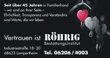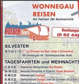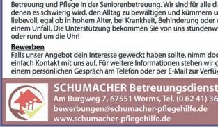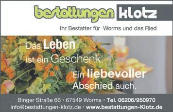 19 SAMSTAG,19.NOVEMBER2022 UnserTIPPfürOnline-Leser SiekönneninvielenAnzeigenaufdenPDF-SeitenunsererOnline-AusgabeaufdiejeweiligeInternet-Adresseklickenum DIREKT mitderHomepage unseresInserentenverbundenzuwerden-dasfunktioniertübrigensauchmitdenMail-AdressenindenAnzeigen-anklickenundE-Mailschicken. TIPSüdhessen Schützenstraße50 68623Lampertheim Tel.06206/94500 E-Mail:info@tip-suedhessen.de www.tip-suedhessen.de Prinz-Carl-Anlage20·67547Worms
