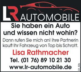 Straße,Nr.: PLZ,Ort: Unterschrift: Name: Vorname: Telefon: *bis 60 Zeichen 5,-L *bis 120 Zeichen 10,usw. ⎫ ⎬ ⎭ ⎫ ⎬ ⎭ Laut§28BDSGwerdendieDatenfürdenGeschäftszweckelektronischverarbeitetundgespeichert. KLEINANZEIGEN GESUCHE PINNWAND VERMIETUNGEN VERKÄUFE KFZ BAR ANKAUF Alle Fahrzeuge PKW‘s, Busse, Geländewagen, Wohnmobile, Wohnwagen, Oldtimer, Traktoren, Bagger. Alles anbieten! (Baujahr, km, Zustand egal). Sofort Bargeld! Jederzeit erreichbar. 06158 - 6086988 0173 - 3087449 KAUFE AUTOS PKW, Busse, LKW, Geländewagen, Wohnwagen/mobile, Traktoren, Bagger, auch mit Mängeln. Zustand egal. Bitte alles anbieten, zahle bar und fair. 24 Stunden erreichbar! 06157/9168006 0177/3105303 SUCHE FAHRZEUGE PKW´s, Busse, Geländewagen, Wohnmobilie etc. für Export, Zustand egal, zahle Höchstpreisesofort Bargeld, bitte alles anbieten, jederzeit erreichbar. 0151/71872306 Tel.: 06258/5089921 WirsucheneinenBungalow, bevorzugtimschönenBobstadt. Tel.06245/905881 „Irgendwann ist irgendwann zu spät!“ JETZT Immobilie diskret und direkt verkaufen. Bitte alles anbieten! Immobilien Kiesewetter GmbH Tel. (01 78) 7 10 07 30 22_11s