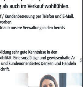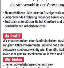 - Sie arbeiten gerne in einem dynamischen Umfeld und sind in der Lage Handlungs- und Gestaltungsspielräume initiativ zu schaffen und zu nutzen - Sie verfügen über eine strukturierte, selbstständige und sorgfältige Arbeitsweise - Ihre Persönlichkeit zeichnet sich durch ein offenes, freundliches, dem Menschen zugewandten Verhalten aus - Sie besitzen gute EDV-Kenntnisse im Umgang mit MS Office-Produkten