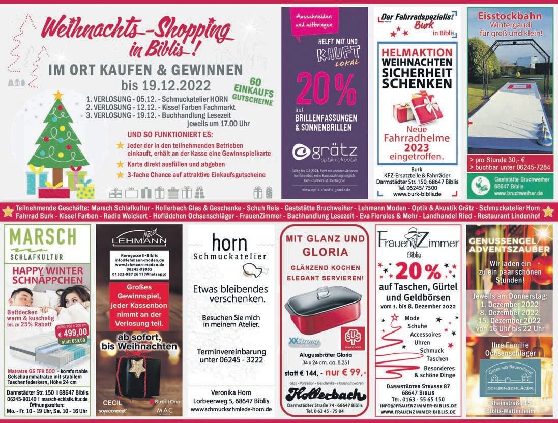 So.,4.Dezember,11UhrGottesdienstinderev.KircheBiblis; Mi., 7.Dezember,16.15UhrProbefür dasKrippenspielinderEv.Kirche (ALLEKinder),19.30UhrÖkumenischesFriedensgebetinderev. Kirche!HerzlicheEinladung!,20 UhrKirchenchorprobe, Do.,8. Dezember,14.30UhrGottesdienst imAltenheim,18UhrKonfirmandenunterrichtimGemeindehaus, 18UhrLebendigerAdventskalender imGartenderFam.Pietschmann, 18UhrGitarrenkursfürAnfänger imJugendhaus,19UhrBandcoachingimJugendhaus; Fr.,9. Dezember,17.30UhrAdventsmarkt imKirchgarten,19UhrJugendtreff imJugendhaus(letzterin2022); Sa., 10.Dezember,10UhrKindergottesdienstimGemeindehaus.