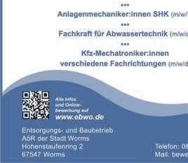 AmbulanterP egedienstinWormssucht P egefachkraft (m/w/d) mit3-jähr.Ausbildung inVoll-od.Teilzeit sowie P egekraft (m/w/d) inVoll-oderTeilzeit fürdenRaumWormsundMannheim. BeiInteressemeldenSiesichbittebei FrauBauer Tel.(0162)9612319
