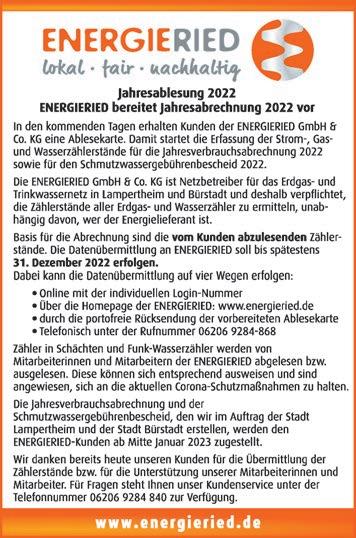 Schützenstraße50•68623Lampertheim•Tel.06206-94500•Fax06206-945010• www.tip-suedhessen.de info@tip-suedhessen.de Samstag,3.Dezember2022·KW48·46.Jahrgang SÜDHESSEN DIEGRATISZEITUNGFÜRDASRIED •staubarmeBadsanierung •barrierefreieBäder •Enthärtungsanlagen •Kundendienst Inh.AndréSpieler·Hospitalstraße·68623Lampertheim·Tel.06206-5803850 •Heizungswartung 22_24m •Heizungsmodernisierung •Heizungsoptimierung •regenerativeEnergien Beilagenhinweis frischerFeldsalatausLampertheim, RiedroderHonig,kaltgepressteÖle,HausmacherWurst,...