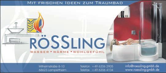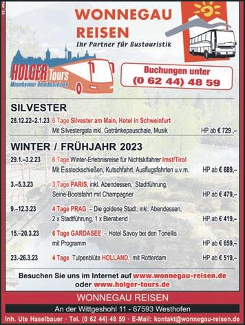 Schützenstraße50•68623Lampertheim•Tel.06206-94500•Fax06206-945010• www.tip-suedhessen.de info@tip-suedhessen.de Samstag,10.Dezember2022·KW49·46.Jahrgang SÜDHESSEN DIEGRATISZEITUNGFÜRDASRIED Kaiserstraße5 68623Lampertheim Tel.06206-4231 Beilagenhinweis •staubarmeBadsanierung •barrierefreieBäder •Enthärtungsanlagen •Kundendienst Inh.AndréSpieler·Hospitalstraße·68623Lampertheim·Tel.06206-5803850 •Heizungswartung 22_24m •Heizungsmodernisierung •Heizungsoptimierung •regenerativeEnergien