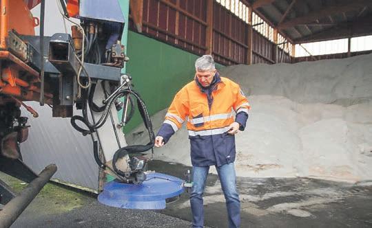 Sole,eineMischung,diebesonders gutaufderFahrbahnhaftetund auchpräventivmitdenStreutellern derFahrzeugebreitverteiltwerden kann.InderzwölfMeterhohen HallederStraßenmeistereiinder AmpèrestraßeinBensheimsind 3.000TonnenSalzeingelagert,ein fünfMeterhoherBergtürmtsich auf,derfürdiegesamteWintersaisongeplantist.Praktischerweise könnendieStreu-undRäumfahrzeugezumSalzladenindieHalle fahren.