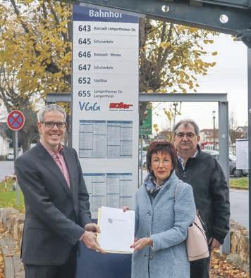 BÜRSTADT/LAMPERTHEIM/ BIBLIS–GeldsegenfürinnerörtlicheProjekteimBereichdes ÖPNVauchinBiblis,Bürstadtund Lampertheim:DerKreisausschuss desKreisesBergstraßehatüber dieVerteilungderinsgesamt 614.000EuroInfrastrukturkostenhilfe2022desLandesHessen,die andenKreisgehen,beratenund einenentsprechendenVerteilungsmodusbeschlossen.Hiernach erhaltenMaßnahmenzurAusweitungdesinnerörtlichenÖPNV-AngeboteseineFörderungvon50 Prozent.DieStadtBürstadterhält indiesemZusammenhang beispielsweiseeineFörderungfür denStadtbusverkehrderLinie652 inHöhevon88.750Euro.Am DienstagüberreichteLandrat ChristianEngelhardtimBeisein vonReinholdBickelhaupt,VerantwortlicherfürdenÖPNVimKreis Bergstraße,denentsprechenden FörderbescheidanderHaltestelle desStadtbussesvordemBürstädter BahnhofanBürgermeisterin BarbaraSchader.