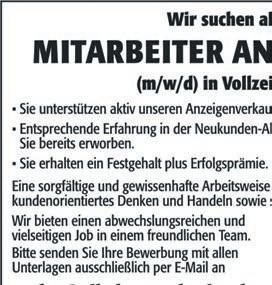 ❑ Betragliegtinbarbei DieAnzeigesollerscheinen: Mittwoch ❑ Samstag ❑ Mittwoch+Samstag ❑ ❑ Verschenken&Tauschen erscheinteinmalkostenlos BeiChiffre-Anzeigen (Aufschlag5,-€)hierankreuzen: ❑ IchholedieZuschriften persönlichab ❑ IchbitteumZusendung perPost *AnzeigenpreisproAusgabe MöchtenSieeinBild mitveröffentlichen (+5,-€)? DieBilddateisollteimTiff-oderim Jpg-Formatabgespeichertsein (Auflösunmöglichst300dpi). Straße,Nr.: PLZ,Ort: Unterschrift: Name: Vorname: Telefon: *bis 60 Zeichen 5,-L *bis 120 Zeichen 10,usw. ⎫ ⎬ ⎭ ⎫ ⎬ ⎭ Laut§28BDSGwerdendieDatenfürdenGeschäftszweckelektronischverarbeitetundgespeichert. KFZ BAR ANKAUF Alle Fahrzeuge PKW‘s, Busse, Geländewagen, Wohnmobile, Wohnwagen, Oldtimer, Traktoren, Bagger. Alles anbieten! (Baujahr, km, Zustand egal). Sofort Bargeld! Jederzeit erreichbar. 06158 - 6086988 0173 - 3087449 KAUFE AUTOS PKW, Busse, LKW, Geländewagen, Wohnwagen/mobile, Traktoren, Bagger, auch mit Mängeln. Zustand egal. Bitte alles anbieten, zahle bar und fair. 24 Stunden erreichbar! 06157/9168006 0177/3105303 SUCHE FAHRZEUGE PKW´s, Busse, Geländewagen, Wohnmobilie etc. für Export, Zustand egal, zahle Höchstpreisesofort Bargeld, bitte alles anbieten, jederzeit erreichbar. 0151/71872306 Tel.: 06258/5089921 VERMIETUNGEN KFZ PINNWAND VERKÄUFE KLEINANZEIGEN Autopark Gernsheim Ankauf aller Fahrzeuge! Auch nach Unfall & ohne TÜV! (0 62 58) 37 73 (0174) 2 02 77 29 22_09s „Irgendwann ist irgendwann zu spät!“ JETZT Immobilie diskret und direkt verkaufen. Bitte alles anbieten! Immobilien Kiesewetter GmbH Tel. (01 78) 7 10 07 30 22_11s GESUCHE