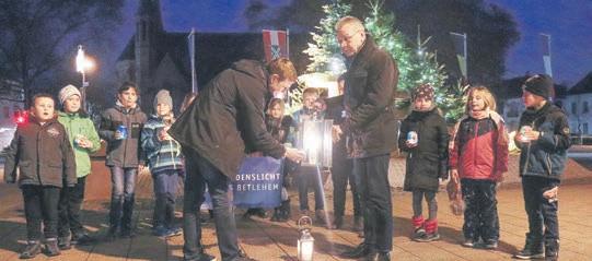 FürdenPfadfinderstammGuydeLarygaudieüberreichtenAliciaundTimSiegelundManuelTybussekgemeinsammitden Wölflingen–denjüngstenPfadfindern–nuneinenTagnachderAussendungdasFriedenslichtanBürgermeisterGottfried Störmer.