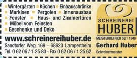 IhrTIP(P)fürerfolgreicheWerbung …auchimInternet www.tip-suedhessen.de Fenster-Türen-Studio F Fahrräder F Reiten R Gartenbau G Optiker O Immobilien I Überdachung Ü www.baier-ueberdachungen.de Otto-Hahn-Str.5•68623Lampertheim•Tel.06206-9513286 •Wintergärten •Sommerhäuser •Überdachungen •Carports•Vordächer •Markisen•Fliegenschutz Schmuck S Schreinerei S Heizung/Sanitär H Dachdecker D Zahnarzt Z Versicherungen V WORLDWIDEWEB FürunsereOnline-Leser SiekönnenindenAnzeigenaufdieInternet-Adresse klicken undwerdenDIREKTmitder HomepageunseresInserentenverbunden–funktioniertauchmitdenE-Mail-Adressen! 10 MITTWOCH,14.DEZEMBER2022