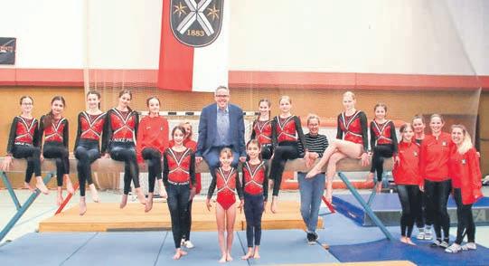 LandratChristianEngelhardthatteaufdemSchwebebalkenPlatzgenommen.DieTurnerinnenundTrainerinnenzeigten sichindenVereinsfarben.