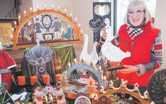 RegionverrietsieimGespräch. ElenaDibnerausNeu-Ulmbemalt mitfeinemPinselstrichalles,was dieKürbisfamilie,kaltesPorzellan, HolzundGlashergeben.Der gemalteKaterPrinzCharles schauteneugierig,einlieber Prachtkerl,derzuhauseschon immerKönigist,wiedieKünstlerinerklärte.Undschonwarder Anhängerverkauft.Bevorsieihre ausdrucksstarkenDamenfiguren mitdemschlankenKürbishals bemalt,modelliertdieKünstlerin zuerstdiefeineNase,danndie Arme,HändeundfiligranenFinger. Überdenstimmungsvollen Adventsmarktsagtsie:„Wirfreuen unsimmeraufLampertheim,hier wirdwirklichdieSeelewarm“. VielekunstvollverzierteWeihnachtskugelnausGlashatBlanka Eimüller,ausdemAllgäukommend,seitmorgensum9Uhr aufgehängt,einefunkelndePracht. DanielaPulweyhateinHerzfür Tiere,diesieinderNaturundin TierparkserlebtundmitdemPinsel aufHolzscheibenmitRinde,zum BeispielvonBirke,Tujaoder Zwetschgeerlebbarmacht.Wiedie kuschelndenFrischlinge,die Bärenfamilie,PferdeundMäuschen unddiebunteVogelwelt.BesonderesundExklusivesgabesauch hier:SchöneGedanken,liebeWorte imhandgeschriebenenBrief,das allesgelingtmiteinemhandgefertigtenFüllfederhalterauskunstvoll geschliffenemHolzmitgoldener Feder.OderdieKunstderSeidenmalerei,inmehrerenSchichten wurdenWachsundFarbenaufgetragen,bisamEndeeinzigartige Textilarbeitenentstandensind.