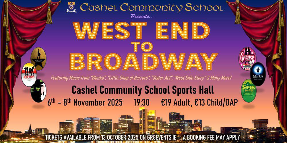 Principal and staff have expressed their pride in the students’ dedication and creativity. “Our musicals are more than performances, they’re a celebration of teamwork, talent, and community spirit,” said one member of the organising team. “We can’t wait to share this incredible show with everyone.” With CCS’s reputation for excellence in musical theatre, “West End to Broadway” is expected to draw large crowds from Cashel and beyond. The event not only highlights the artistic achievements of the students but also reinforces the school’s role as a cultural hub in the region. Tickets are available now, and organisers are encouraging early booking to avoid disappointment. For anyone who loves the thrill of live theatre, this is one show you won’t want to miss.