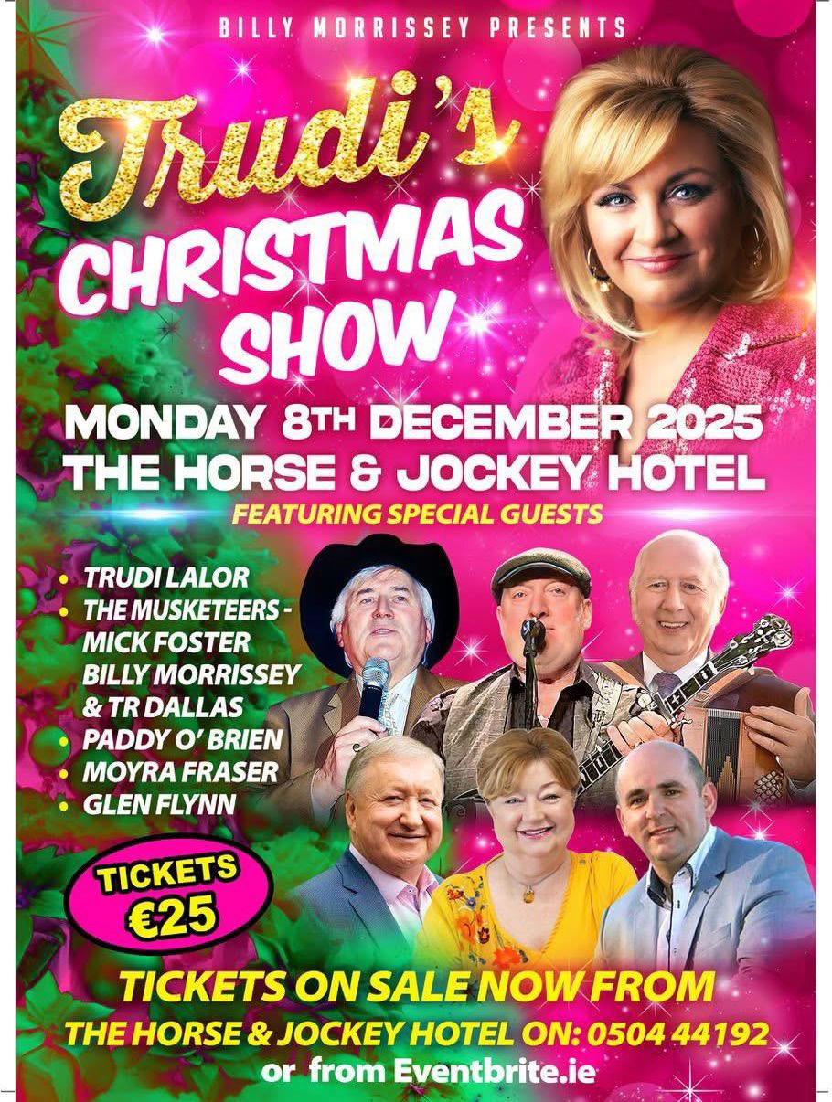 on-line from Eventbrite or directly from the Horse and Jockey Hotel ( 0504-44192). Early booking is advised as this will be another sellout for Trudi’s Christmas Concert on Monday 8th of December.