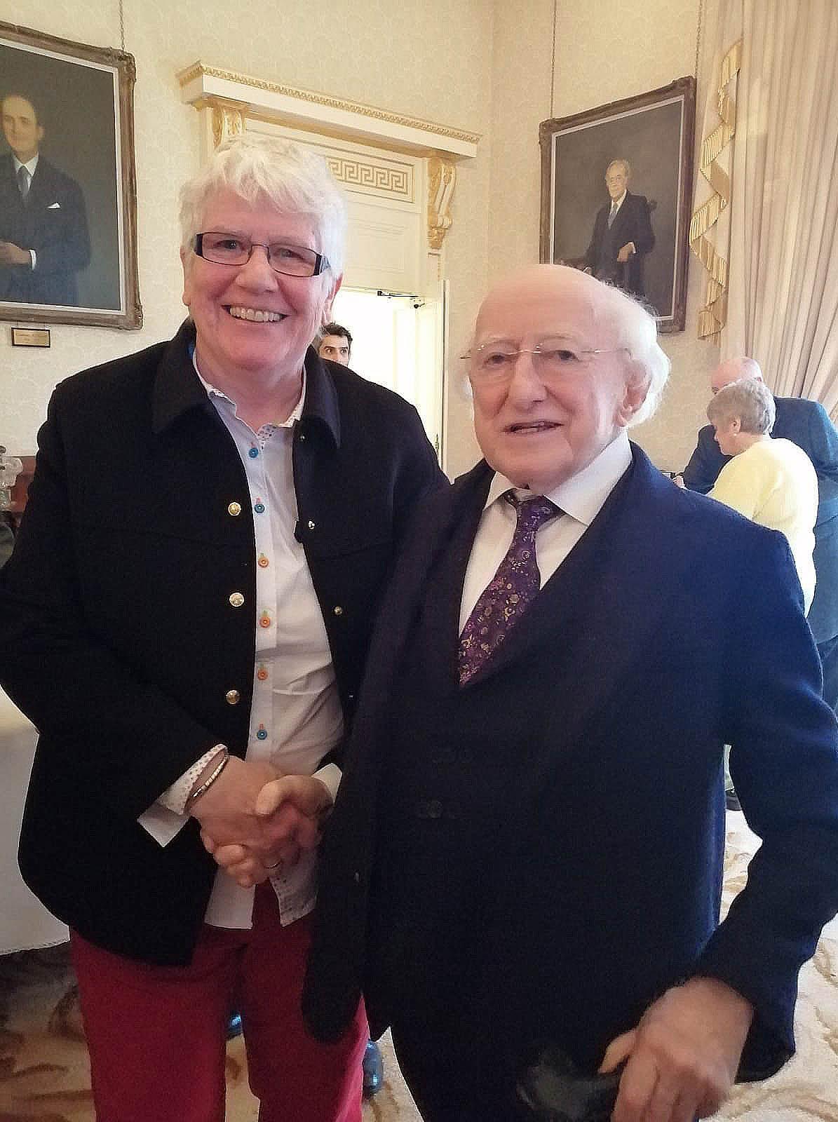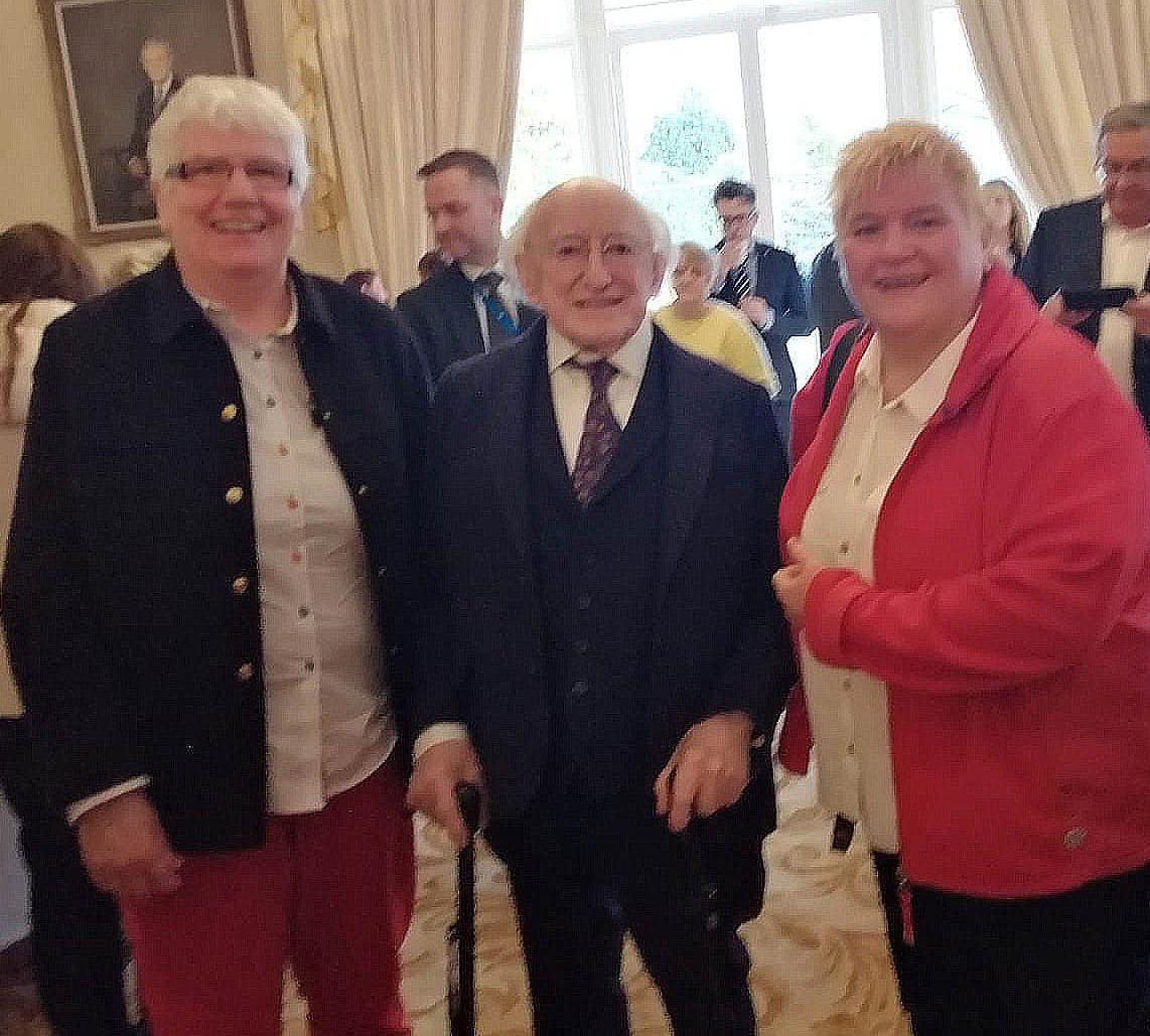 Eleanor and wife Sharon share a happy moment with President Michael D. Higgins at the reception in Aras an Uachtaráin last week.