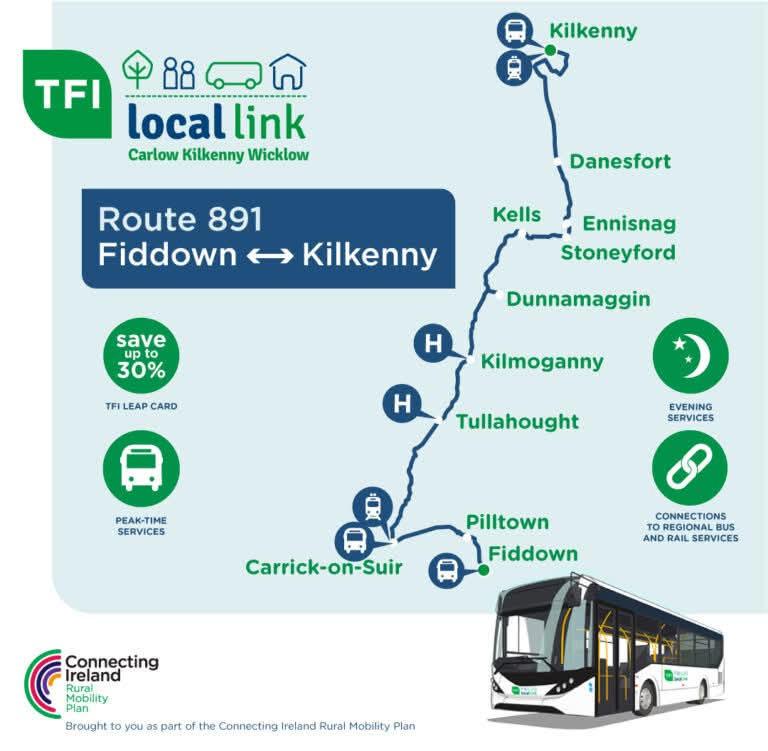 A new local link service has been introduced between Kilkenny and the village of Fiddown, 7 km east of Carrick-on-Suir. The service operates five daily return services between Monday and Saturday and four services on Sundays and Bank Holidays.