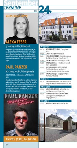 ATELIER PUPPENSPIEL: Zwerg Nase, ab 4 J. GALLI THEATER: Froschsalat HAUS DACHERÖDEN: Preisträgerlesung der Aktion „Erfurter Federlesen“ h KINOKLUB: Klasse Deutsch (DE, 2018) KINOKLUB: Gloria – Das Leben wartet nicht (USA, 2018) BUCHHANDLUNG PETERKNECHT: Der Blaubär-Roman wird 20½ – Dietmar Wunder liest Walter Moers KINOKLUB: Es gilt das gesprochene Wort (DE/FR, 2019)