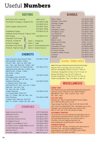 CHURCHES New Community Church 07970 804708 Methodist Church 023 8026 8803 St Francis Church 023 80271152 St Boniface Church (C of E) 023 8026 5977 St Edwards Church 023 8027 3882 St Martin in the Wood (C of E) 023 8026 5977 St Peter’s Church, Boyatt Wood (C of E) 023 8061 1227 United Reformed Church 023 8027 6791 Velmore Church 023 8057 1414 Churches Together in Chandlers Ford www.ctcf.org.uk