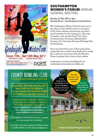SOUTHAMPTON WOMEN’S FORUM ANNUAL GENERAL MEETING Monday 15 May 2017 at 3pm Seminar Room - Southampton Central Library. The Southampton Women’s Forum invite you to join them at their AGM to listen to the report of the Chair, celebrate achievements and elect a new Committee for the coming year. The main Committee roles include Chair, Vice Chair, Communications Secretary, Administrative Secretary, Vice Secretary, Treasurer, Meetings Host and Fundraiser. If you are interested in any of these posts please contact them by e-mail for more details. If you would like to find out more about what the Women’s Forum do, please have a look at their website. southampton.womens.forum@gmail.com southamptonwomensforum.weebly.com