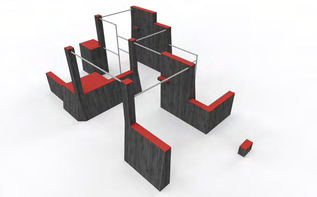 The wall elements of parkour structures are made of sustainable cross-laminated timber (CLT) to ensure high stability and durability despite constantly changing atmospheric humidity. A four-stage treatment process has been employed to make the wood weatherproof. The top edges of wall elements are covered with rubber coated anti-slip plastic which comes in two colour options: grey or red. Horizontal pipes are made of stainless steel. The structure is meant to be fixed on surface (e.g. 150mm reinforced concrete slab foundation). Ground fixings are made of hot-dip galvanized metal.