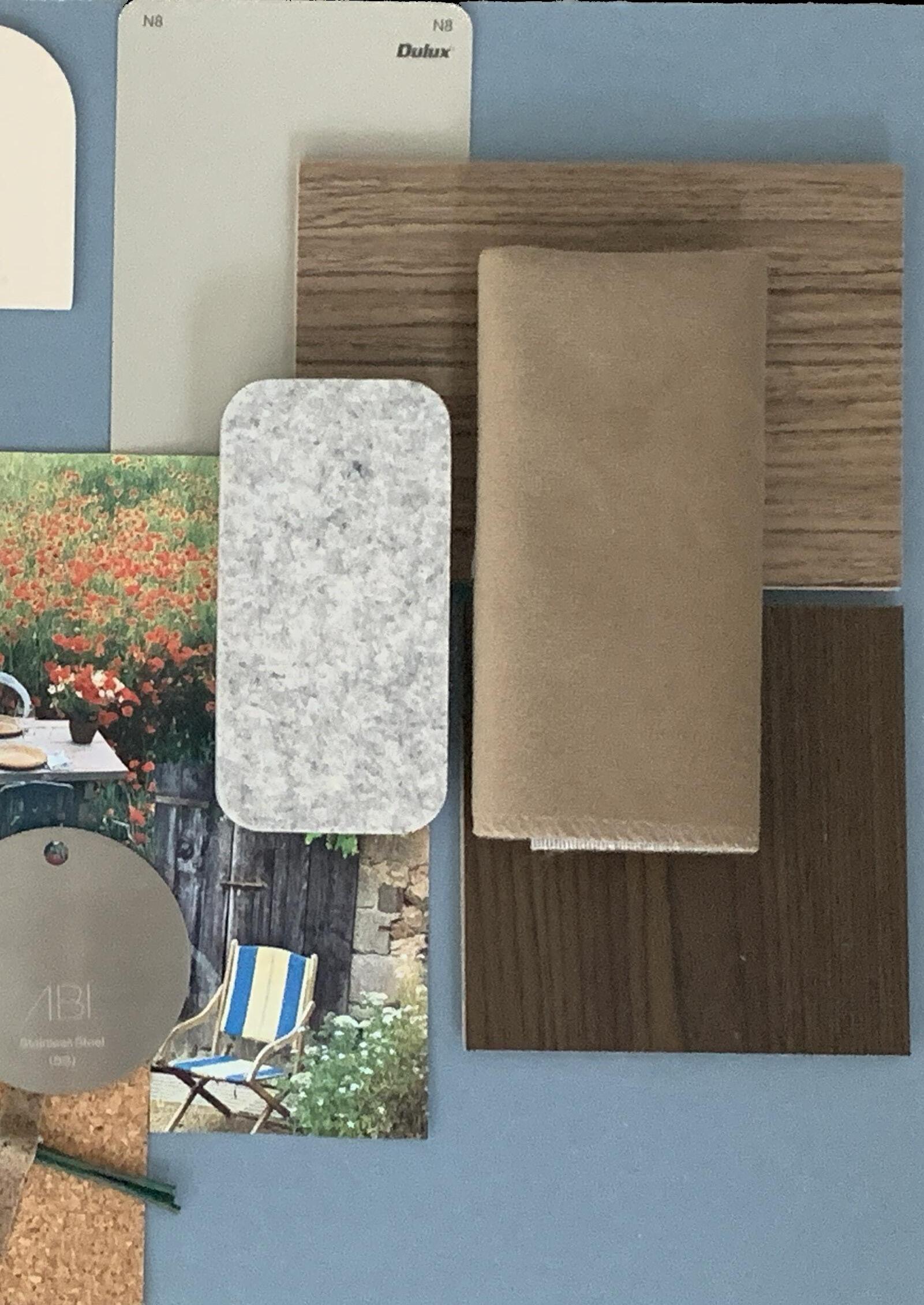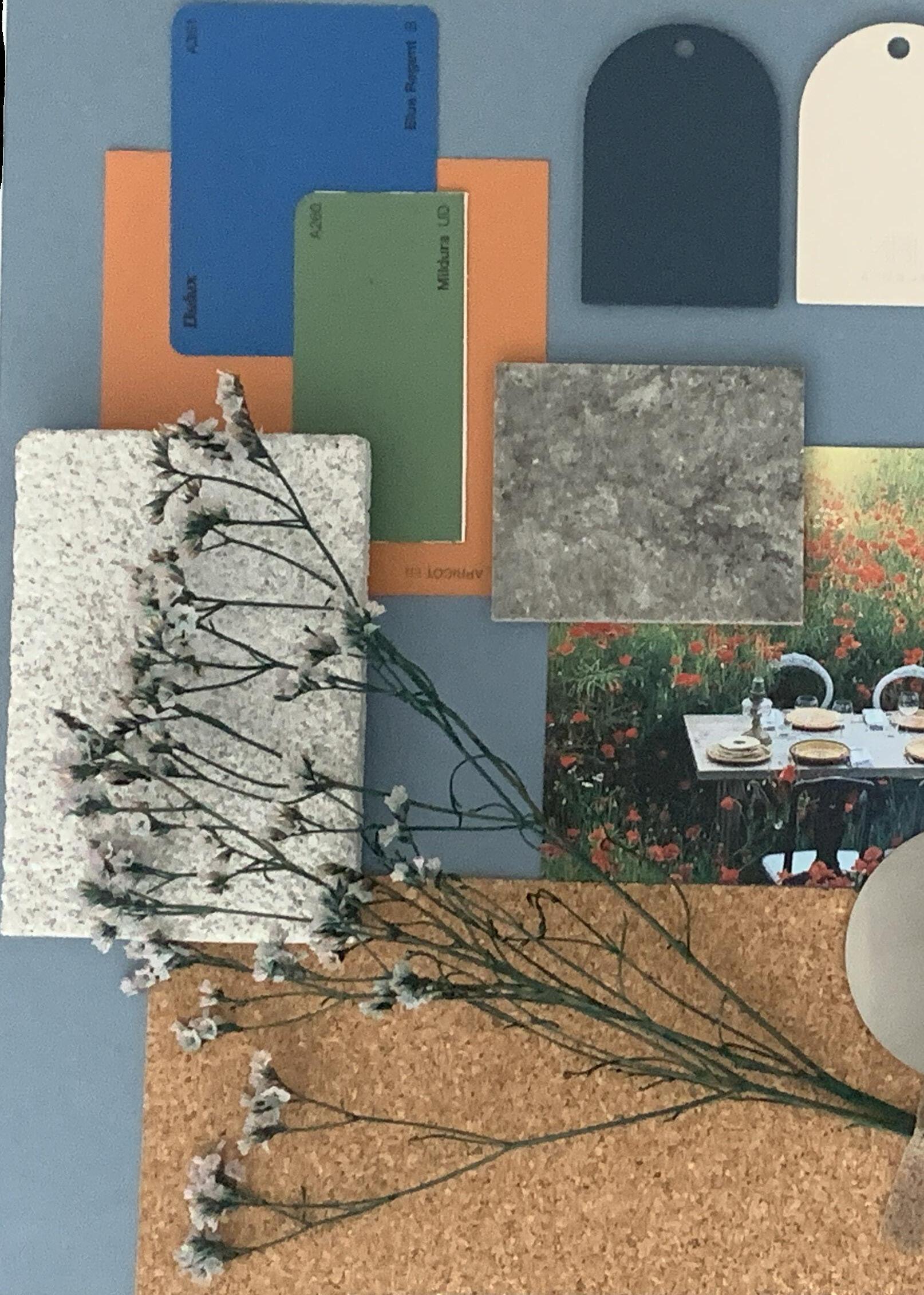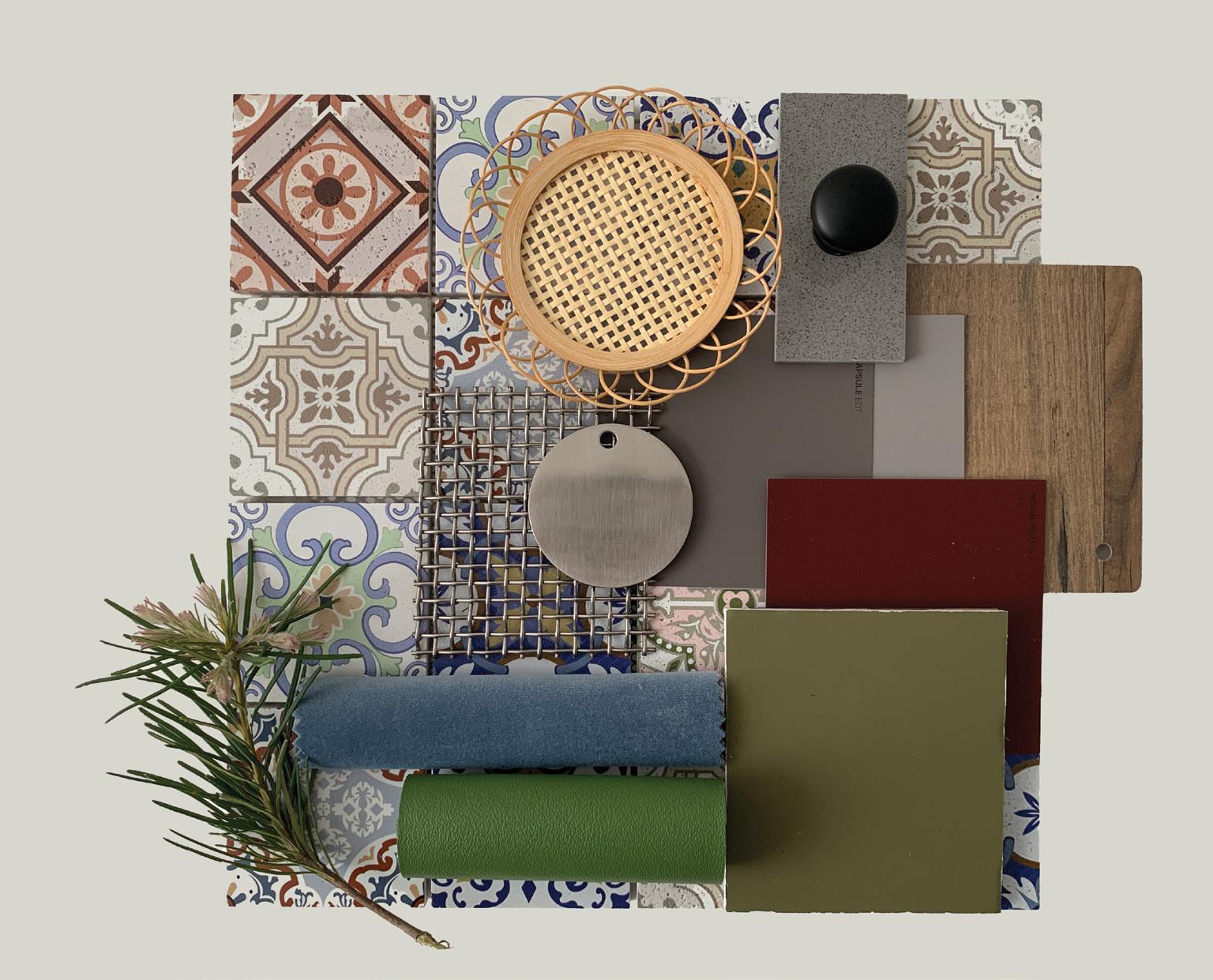The aim is to blend the contemporary aspect house and its surroundings by using a range natural feel. This includes a textured fabric stone, various shades of green to create a and neutral colours to promote relaxation Additionally, contrasting elements such as touches of red are incorporated to achieve a charming aesthetic.