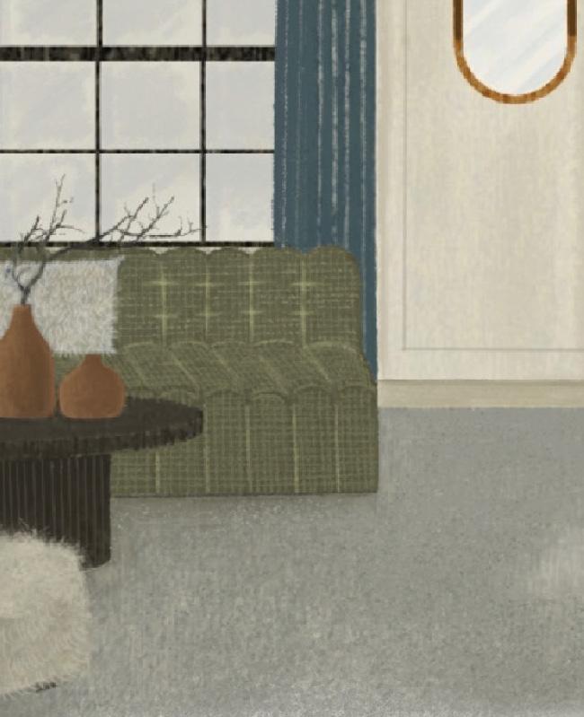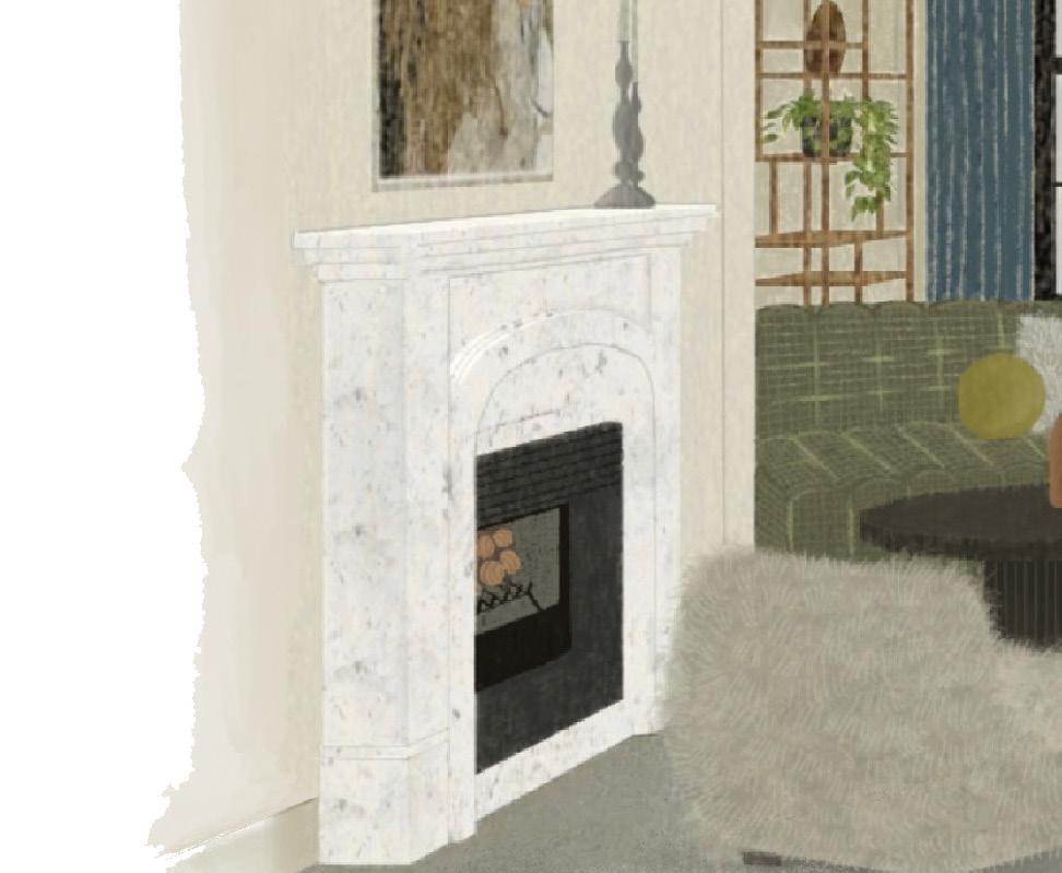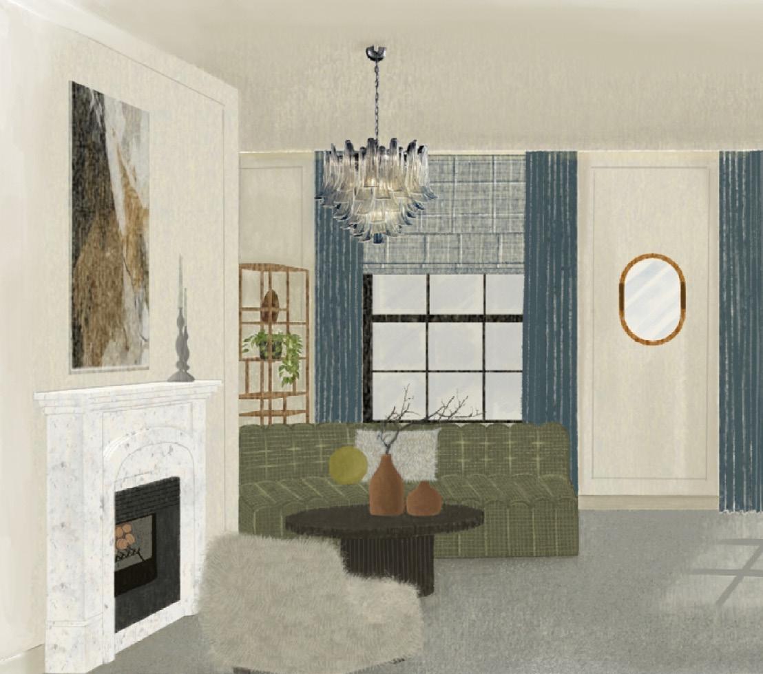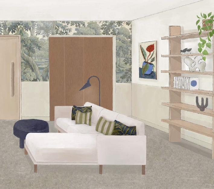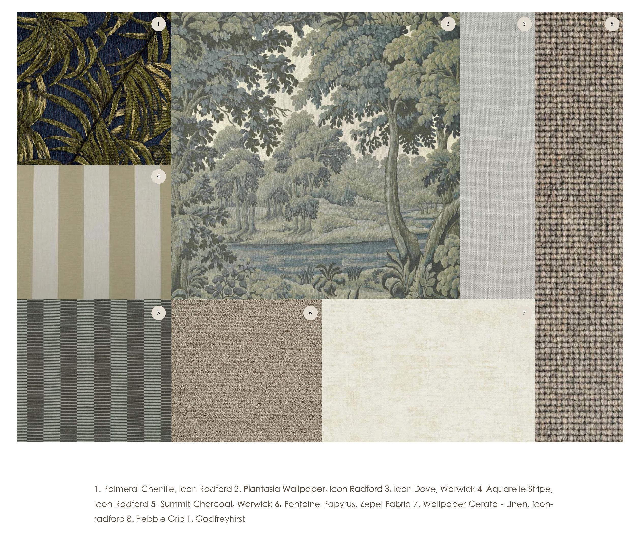 The aim is to blend the contemporary aspect house and its surroundings by using a range natural feel. This includes a textured fabric stone, various shades of green to create a and neutral colours to promote relaxation Additionally, contrasting elements such as touches of red are incorporated to achieve a charming aesthetic.