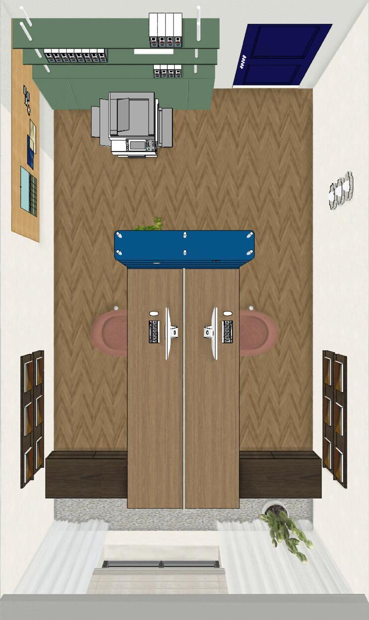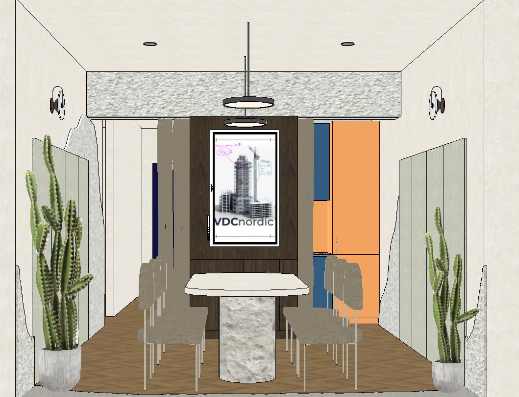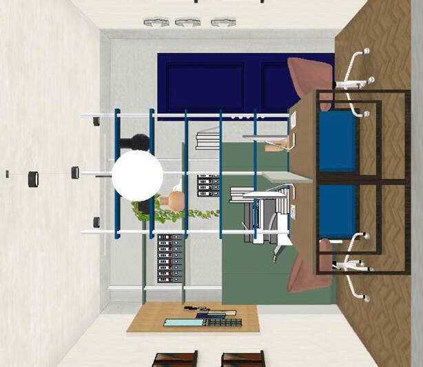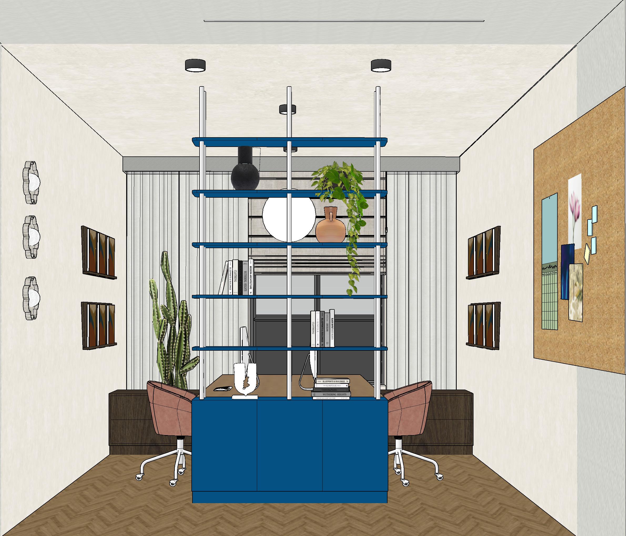 The administration office is designed to promote productivity, with inspiring elements throughout the room. Various colours are used alongside minimalistic features to facilitate a functional workspace for employees. The large pendant light and other fixtures provide appropriate illumination. Additionally, a small indoor garden by the windows adds a touch of greenery and freshness to the office.