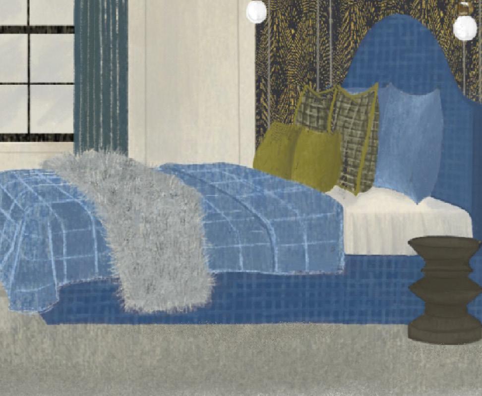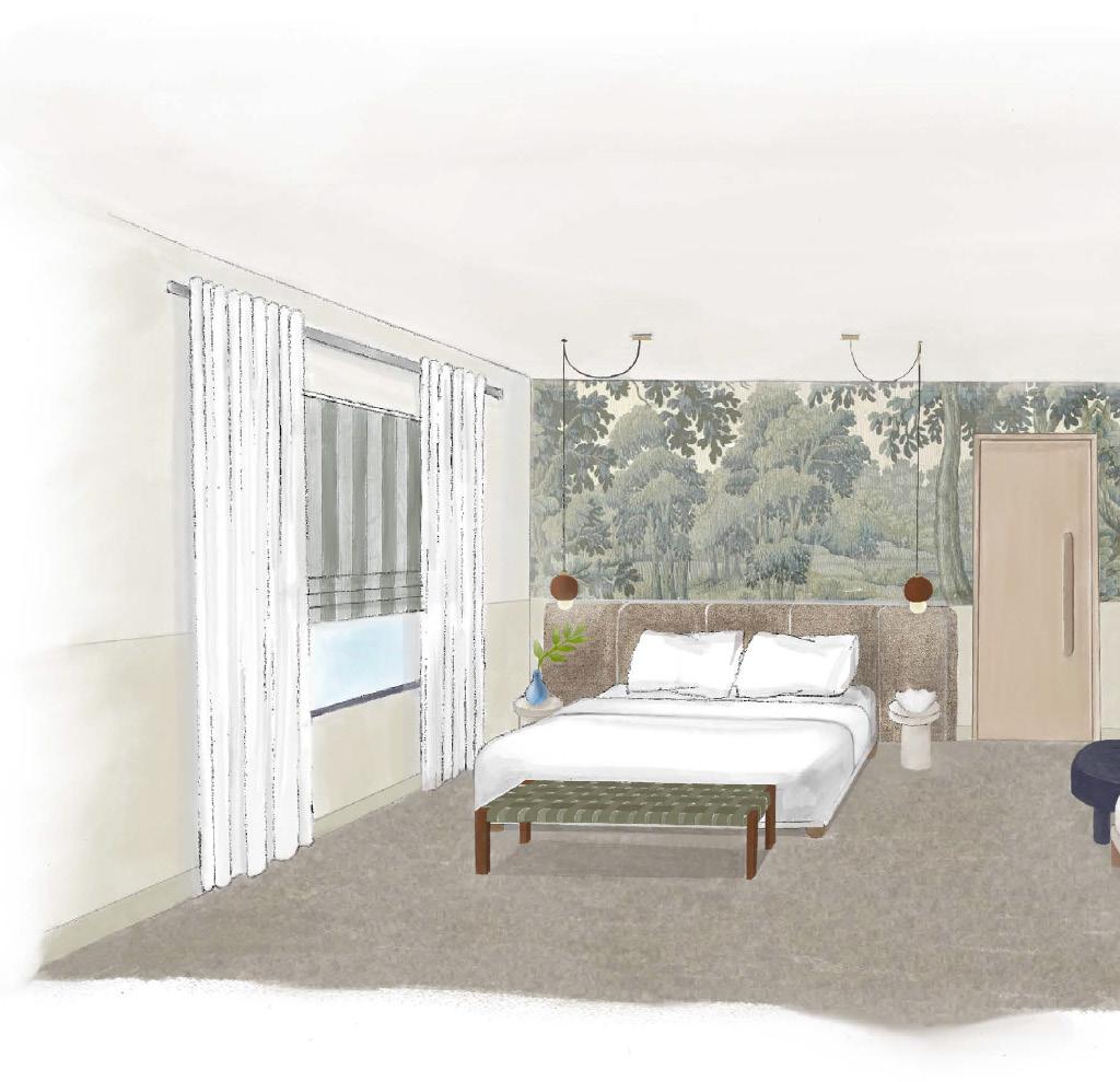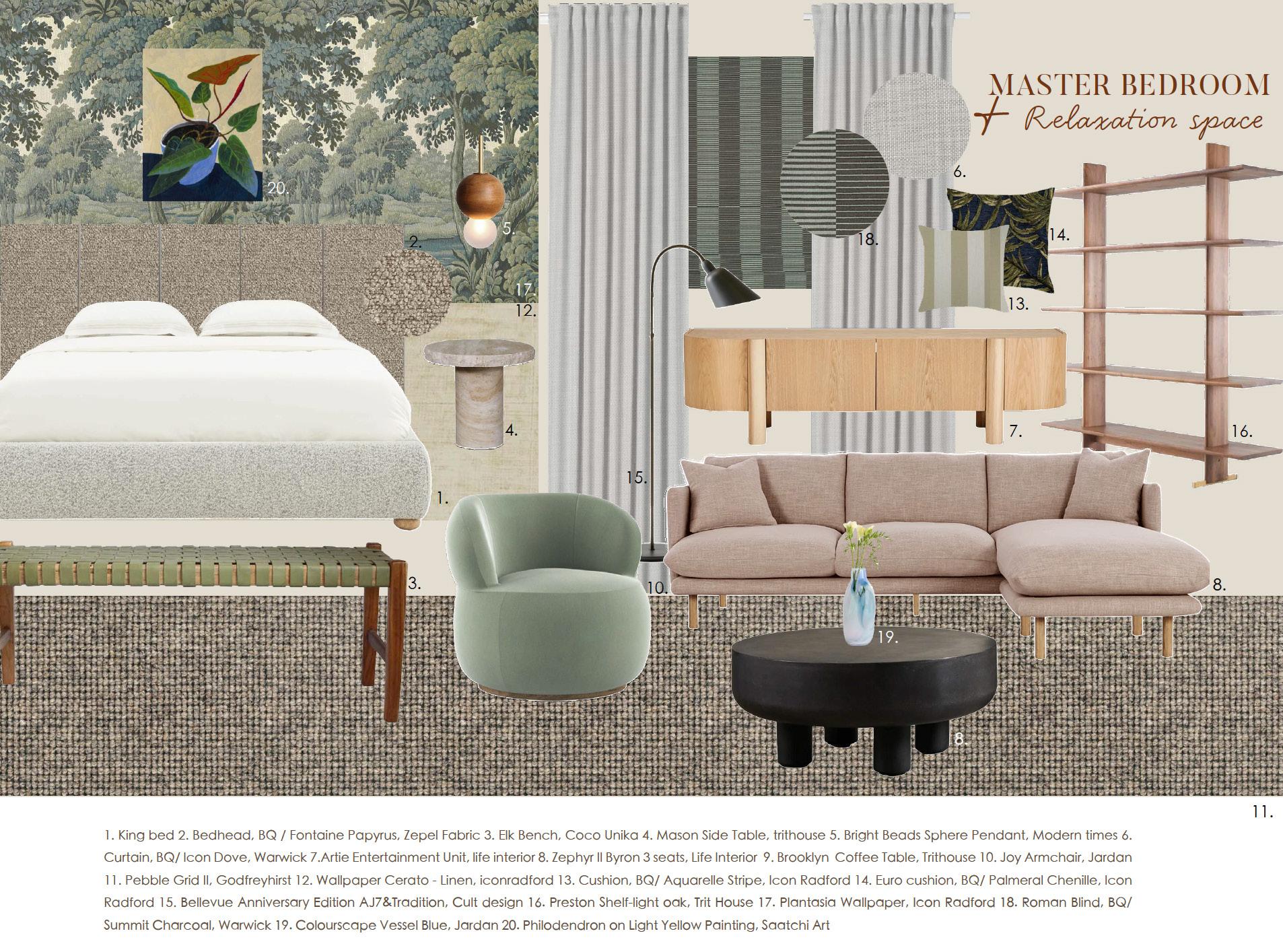 A lavish master bedroom exudes elegance, sophistication, and comfort, creating a sanctuary of luxury and relaxation. The design blends opulent materials such as plush fabrics, rich wood, and gleaming metallic accents with timeless elements like a statement chandelier, upholstered bedhead, and bespoke furnishings. The colour palette features tones of deep jewel, soft neutrals, and rich earth shades to enhance the room’s vibration.